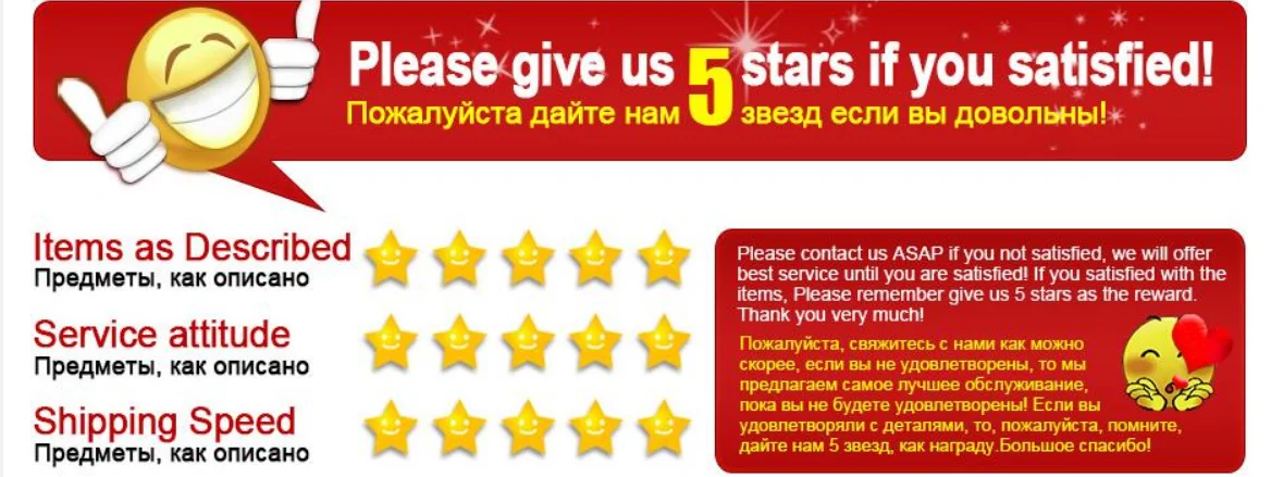 1. Уважаемый клиент, ваши отзывы очень важны для нас, если вы удовлетворены нашей продукцией, пожалуйста, дайте нам очень хорошие отзывы за несколько секунд (все 5 звезд), большое спасибо