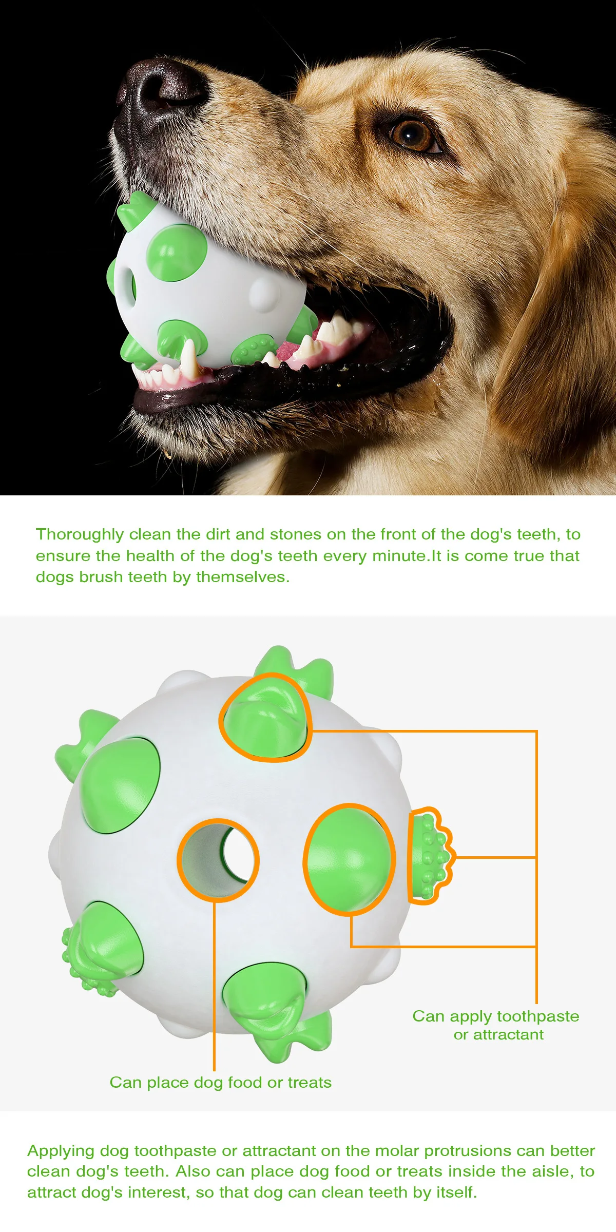 2.Уникальный дизайн для ухода за зубами:Поверхность этой игрушки-жевательного мяча для собак принимает 3D дизайн с тремя различными фигурами, чтобы эффективно очистить различные зубы питомца и защитить его здоровье зубов. Заправьте лакомство внутри и приведите вашу собачку в дикую природу. Собаки будут кусать их, чтобы глубоко очистить зубы самостоятельно, играя в жевательную игрушку.