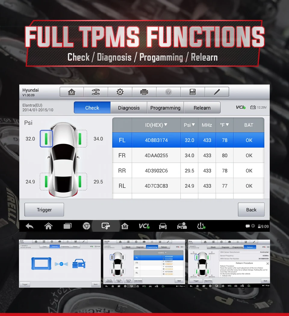 1.TPMS Check:The Check function allows users to activate TPMS sensors to view sensor data – sensor ID, tire pressure, tire temperature, battery condition and sensor location.