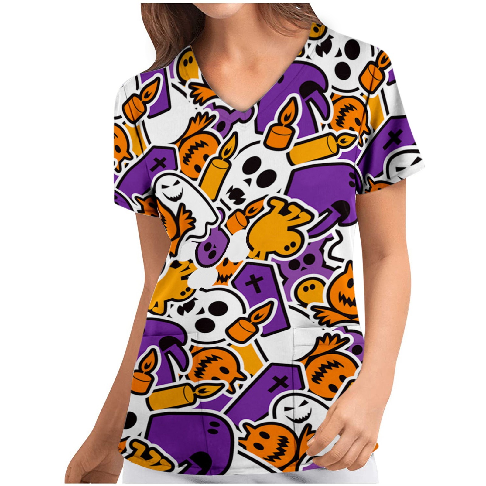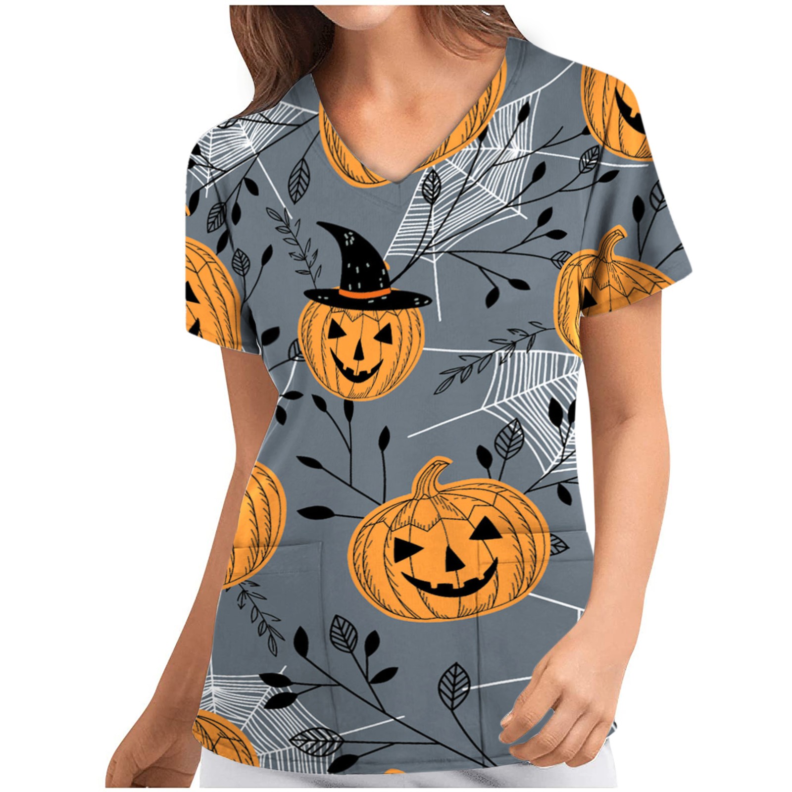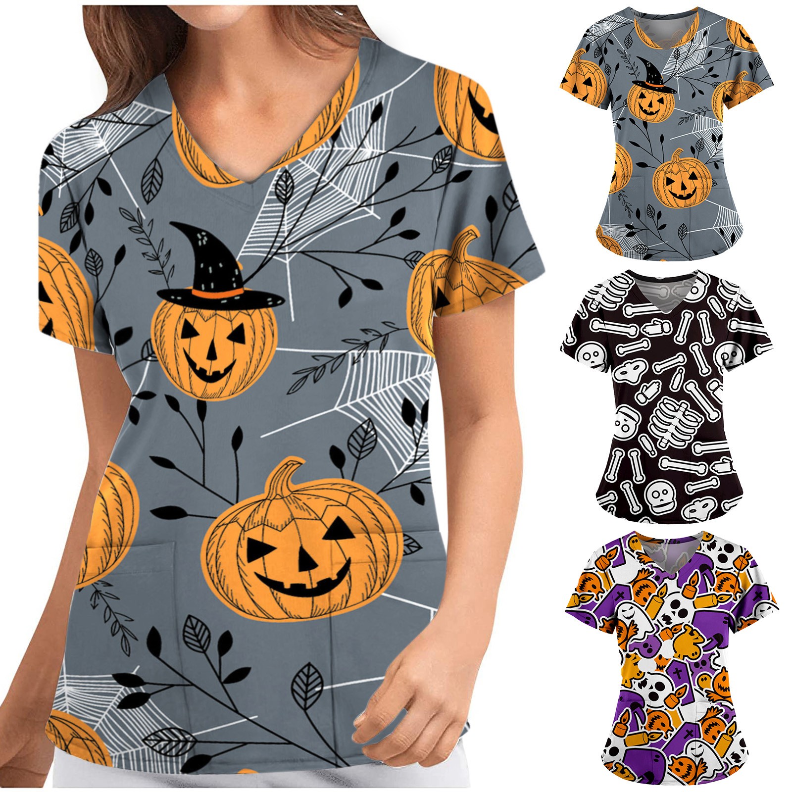 Женский топ с коротким рукавом и v-образным вырезом с рисунком тыквы на Хэллоуин, футболки для медсестер