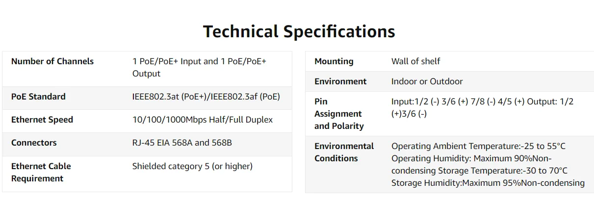 Wall-Mount design, Plug and Play, no other settings required. No external power required. Pin Assignment and Polarity Input: 1/2 (-), 3/6 (+), 4/5(+), 7/8(-), Output: 1/2 (+), 3/6 (-).