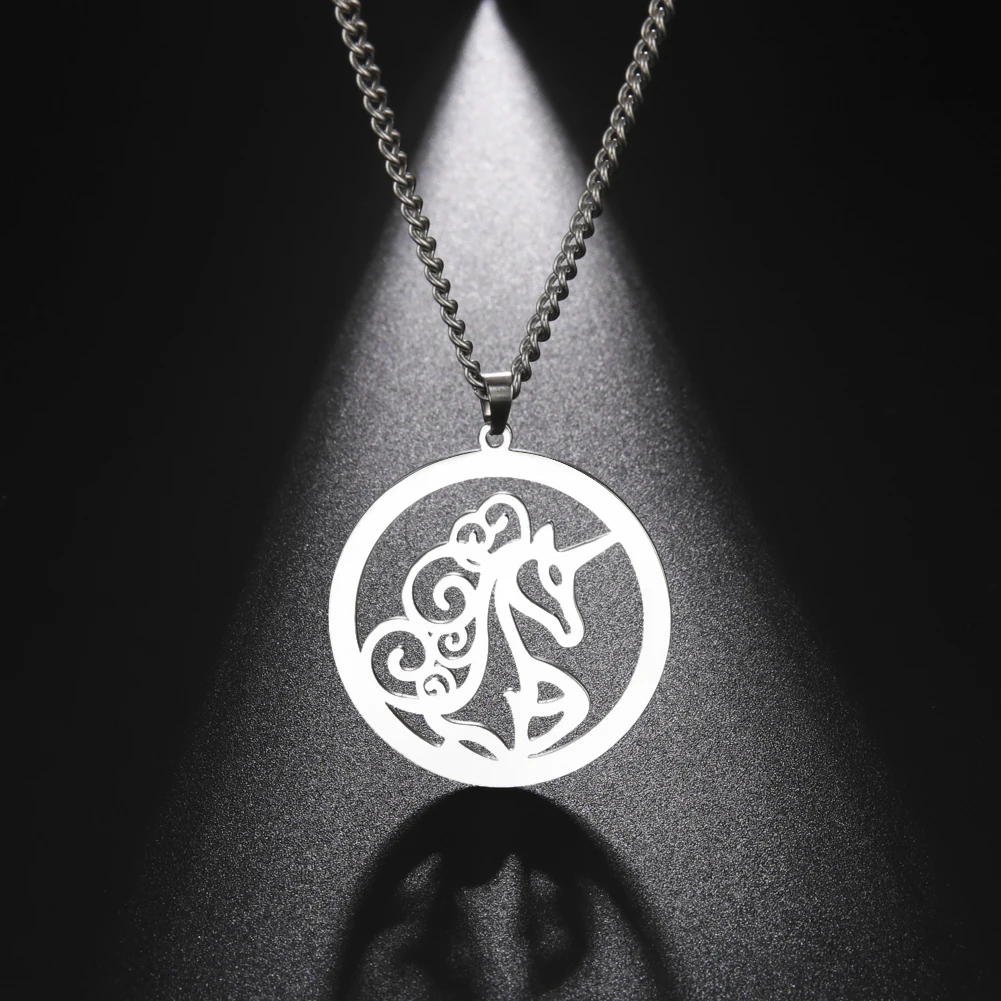 Наименование товара: Романтические ожерелья с лошадью в форме единорога для мужчин и женщин, крутые ожерелья из нержавеющей стали с круглой подвеской в виде животного, модные ювелирные изделия