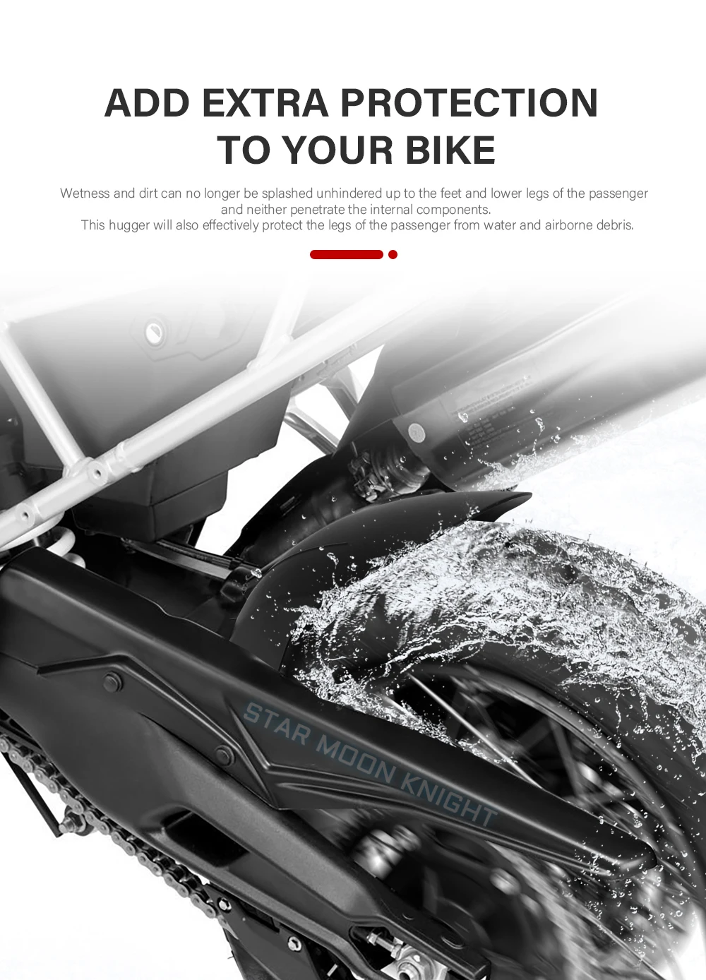 2. Мокрость и грязь больше не могут быть разбрызгированы до ног и нижних ног пассажира и не проникают внутрь внутренних компонентов. Этот hugger также эффективно защитит ноги пассажира от воды и воздушного мусора.