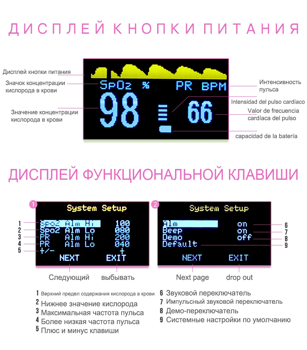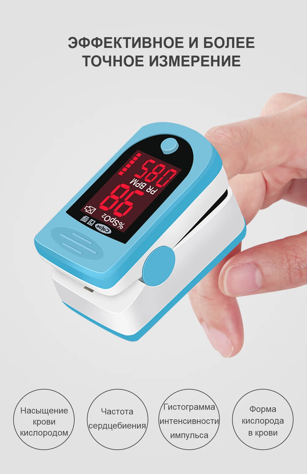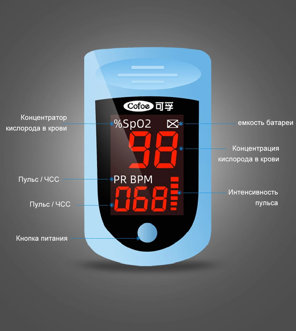 ----- Пальчиковый оксиметр интегрирует технологию светового зондирования в чип, без сбора образцов крови человека, и контролирует содержание кислорода в крови через световое зондирование проникновения, И может контролировать насыщенность крови кислородом и параметры пульса.