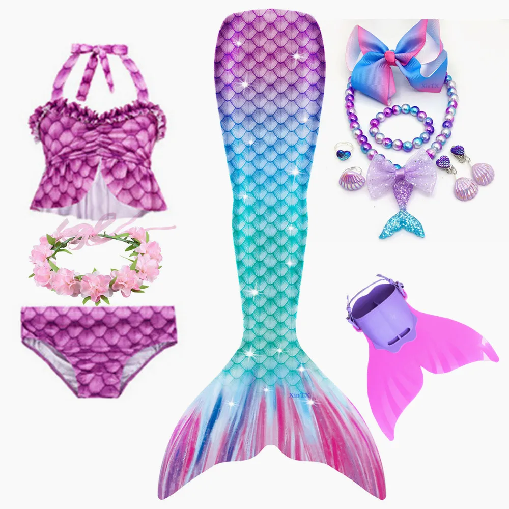 6 шт.: 1 * хвост русалки + 1 * бюстгальтер + 1 * шорты + 1 * монофин + 1 * головной убор + 1 * ожерелье