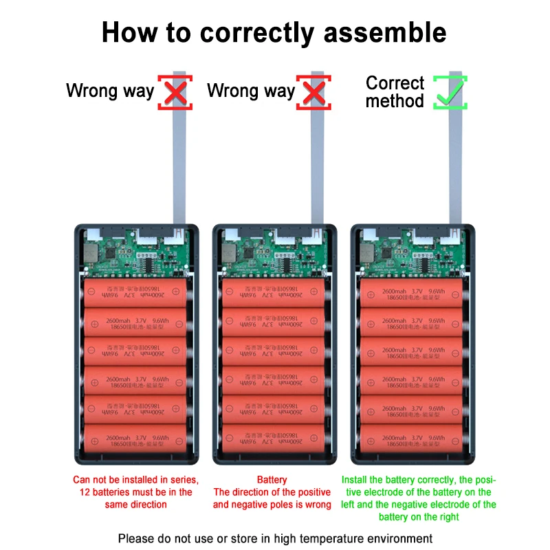 Примечание: Может использоваться только 18650 плоских батарей, и напряжение соответствует напряжению 3,2-4,2 в. Вам нужно использовать совершенно новые батареи. Старые батареи и поврежденные батареи вызовут сбой работы, неправильное подключение положительных и отрицательных полюсов, и в первый раз вам нужно использовать батарею полностью