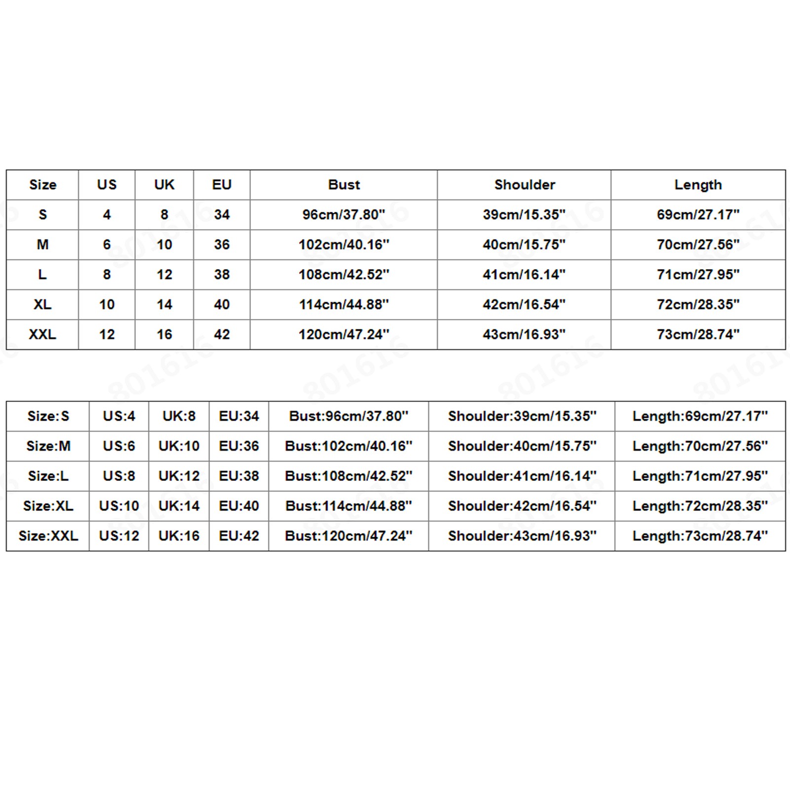 Размеры США Великобритания ЕС Бюст Плечо Длина S 4. 8 34 96 см/37,80'' 39 см/15,35'' 69 см/27,17'' М 6 10 36 102 см/40,16'' 40 см/15,75'' 70 см/27,56'' L 8 12 38 108 см/42,52'' 41 см/16,14'' 71 см/27,95'' XL 10 14 40 114 см/44,88'' 42 см/16,54'' 72 см/28,35'' XXL 12 16 42 120 см/47,24'' 43 см/16,93'' 73 см/28,74''