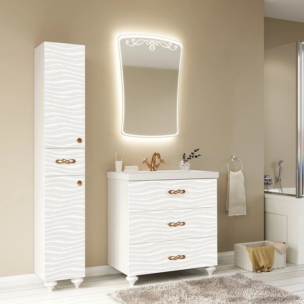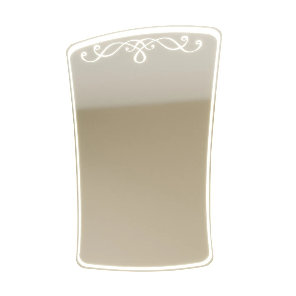 Используется зеркальное полотно производства Бельгии и Франции. Основа полотна из серебряной амальгамы, что значительно увеличивает срок эксплуатации зеркал. Зеркала декорированы рисунком методом художественного матирования со светодиодной подсветкой