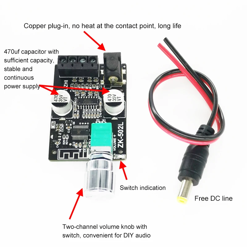 Обычно используемые динамики, как правило, 8 Ом, не могут отличить положительную и отрицательную полярность, эффект такой же, могут также использоваться динамики 4 Ом. Если мощность вашего динамика низкая, она может быть между 10 Вт-30 Вт. Напряжение источника питания должно быть ниже, чтобы предотвратить сжигание динамика после громкого. Например, выберите источник питания ниже 15 В. Если вы являетесь динамиком 50 Вт-200 Вт, вам не придется беспокоиться о проблеме горения динамика. Вы можете выбрать источник питания 12-24 В. Чем выше напряжение, которое вы выбираете, тем больше звука или мощности вы можете выпустить.