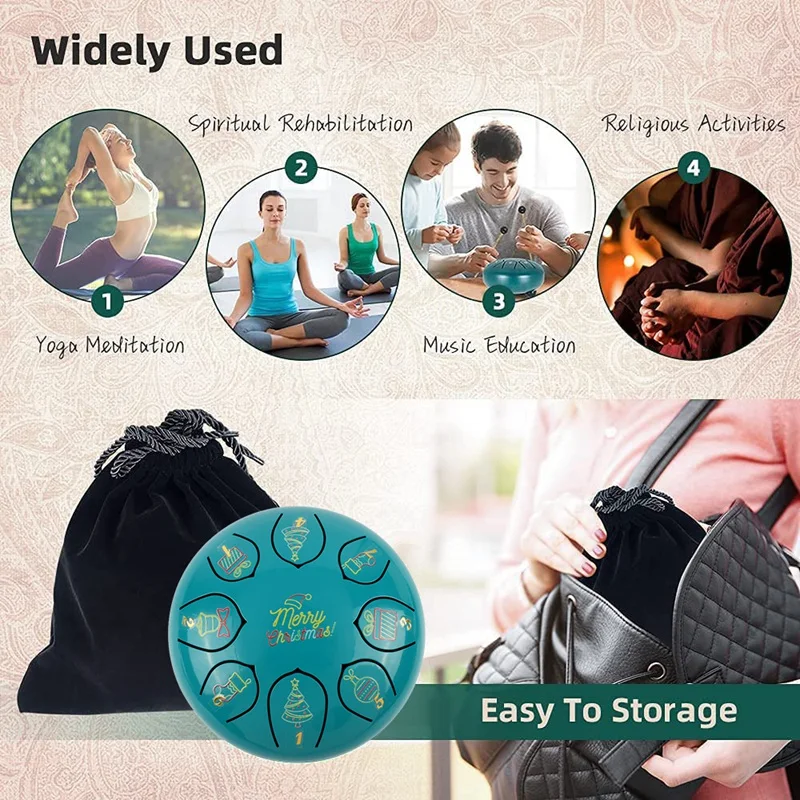 [Новый Материал] новый тип материала высокого качества. Стальной барабан удаляет «железные» примеси, делая звук барабана более чистым и эфирным. Также 3 резиновых основания делают его более устойчивым и не скользят.