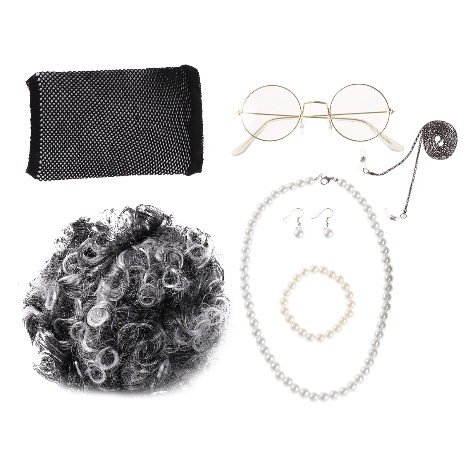 Комплект включает в себя: 1 шт. парик для пожилых женщин, 1 пара очков для бабушек, 1 шт. ремень с цепочкой для очков, 1 шт. искусственные жемчужные бусины для шеи, 1 шт. искусственные жемчужные бусины для браслетов, 1 пара искусственные жемчужные бусины жемчужные серьги с бисером, 1 шт. парик для париков