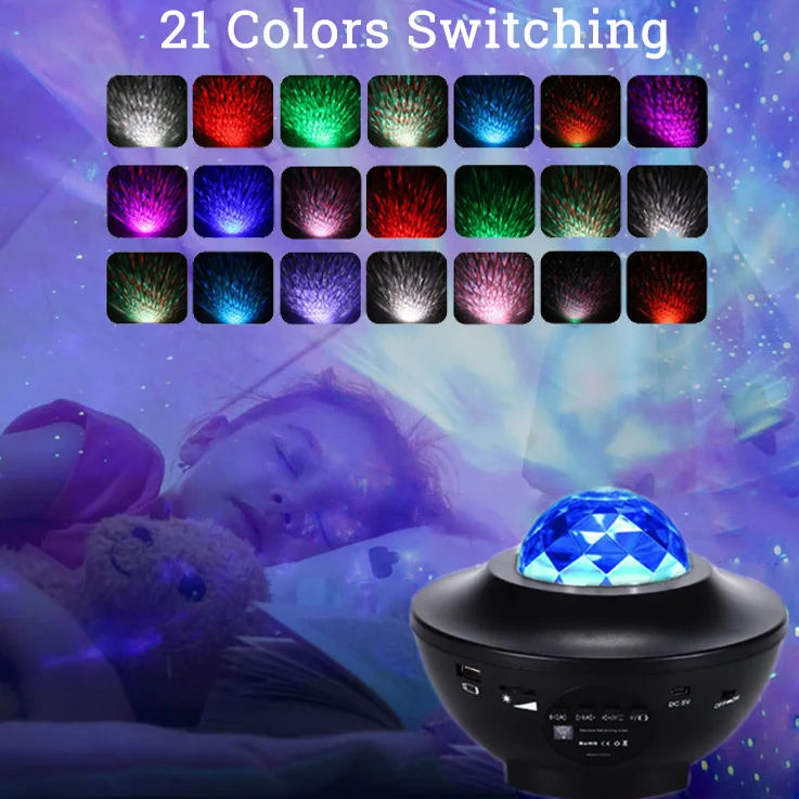 Пять стандартных цветов: красная волна воды, синяя волна воды, Зеленая волна воды, белая волна воды и зеленая лазерная точка, каждый из двух цветов может быть смешан, и каждый из двух цветов волны воды также может быть смешан с зеленой лазерной точкой, Таким образом, вы можете получить как большинство 21 цветов. Разные цвета в сочетании с динамической ночной проекцией различных скоростей, создавая расслабленную, романтичную, красочную атмосферу проекции пространства, чтобы показать вам великолепный Звездный светильник.