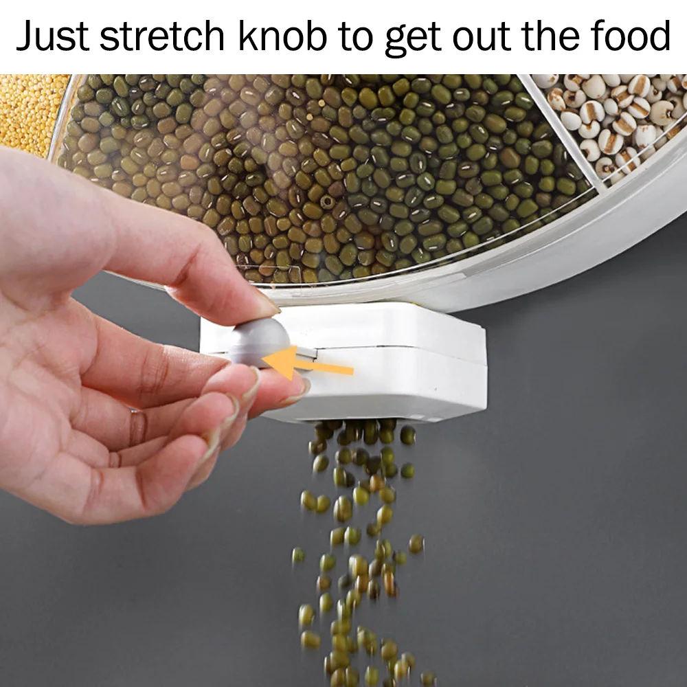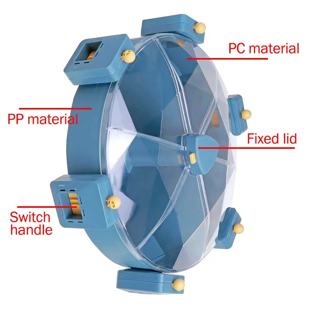 -6 отсеков большой емкости: 6 внутренних перегородок могут поворачиваться на 360 ° по желанию. Прозрачный корпус может видеть еду в коробке, и большая емкость может содержать все виды сухой пищи.