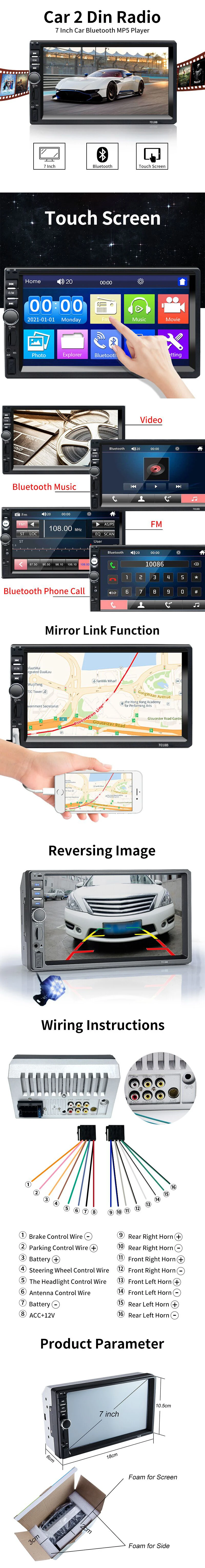 Автомобильный Радио HD 7 "сенсорный экран стерео Bluetooth 12 В 2 Din FM ISO мощность Aux вход Авто MP5 плеер SD USB