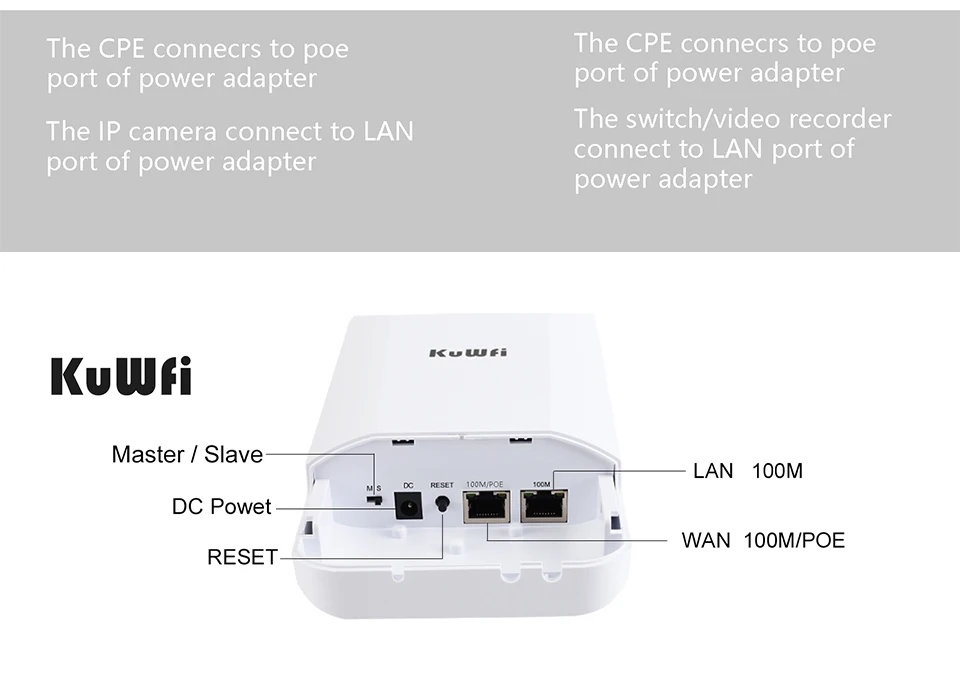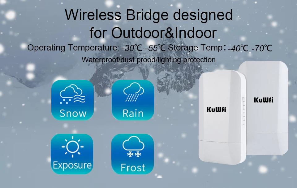 3. Открытый беспроводной CPE Мост водонепроницаемый, пыленепроницаемый, защита от освещения. С ABS водонепроницаемый, пыленепроницаемый и солнцезащитный кожух, избегайте повреждений от пыли, грозы погоды. Рабочая температура может быть нормальной при-40 ℃ до 70 ℃. Подходит для любой страны.