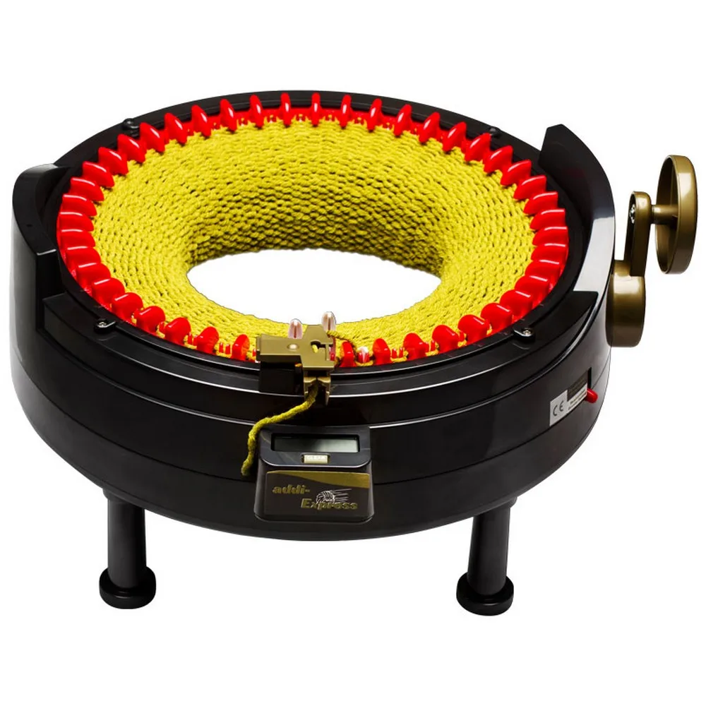 Машинка для вязания "Addi-Express Kingsize" с электронным счетчиком (на ранних моделях устанавливался механический счётчик), установлено 46 игл. Диаметр связанного изделия по кругу 35 см, ширина прямого полотна 45 см. Рекомендуемая пряжа 3 - 8 мм. Машинка позволяет за считанные минуты «накрутить» даже самые сложные модели.