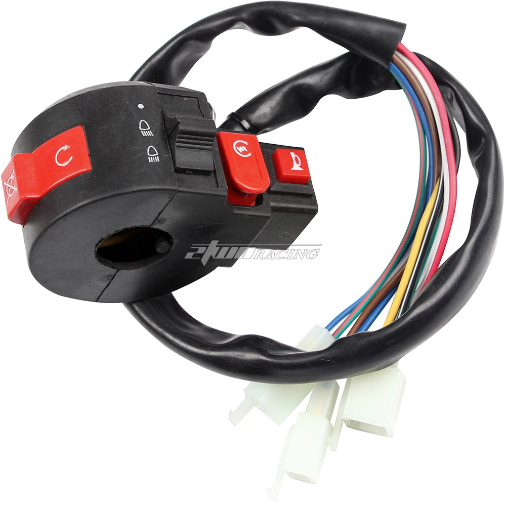 4 функции: переключатель включения/выключения зажигания, светильник дальнего/ближнего света, переключатель электрического запуска. Переключатель рога.