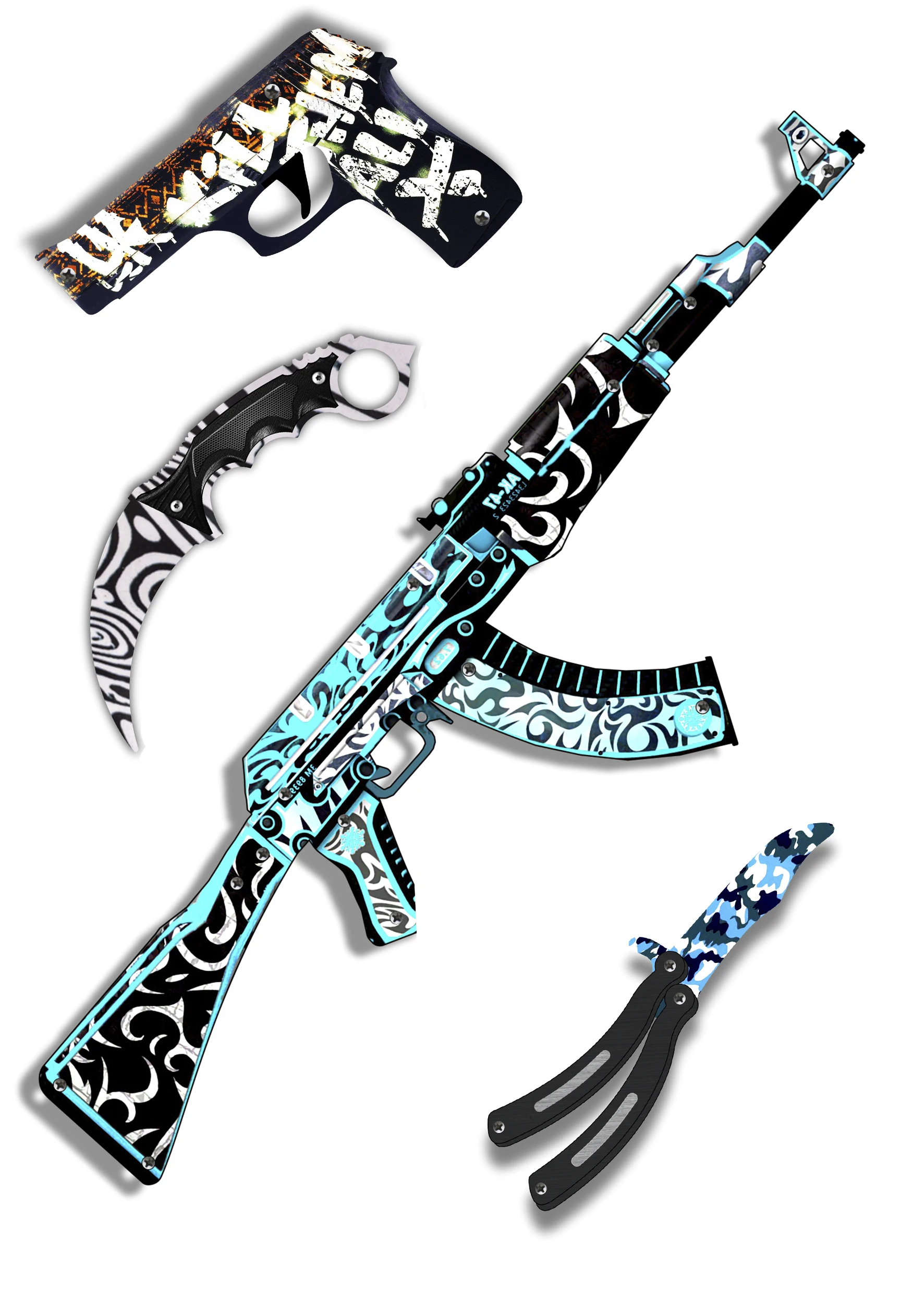 The set includes: a butterfly knife, an automatic machine, a rubber gun, a kerambit knife.