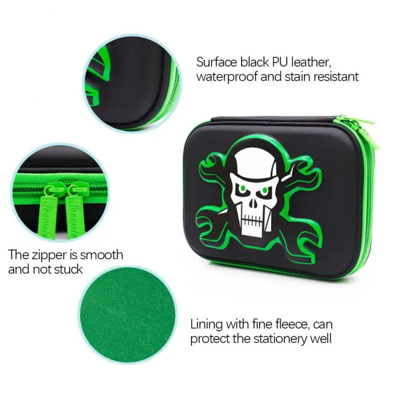 Черный цвет из искусственной кожи на поверхности, водонепроницаемый и грязеотталкивающий. Молния гладкая и не загибается. Подкладка из тонкого бархата хорошо защищает канцелярские принадлежности. Материал EVA-светильник, мягкий, в форме, легко чистится и удобен в использовании.
