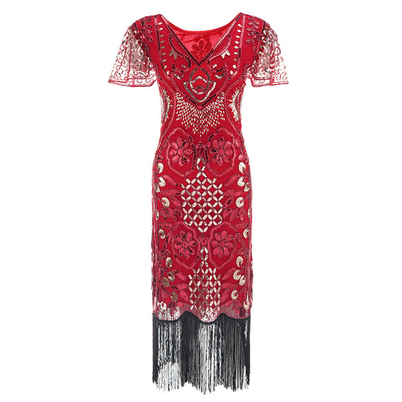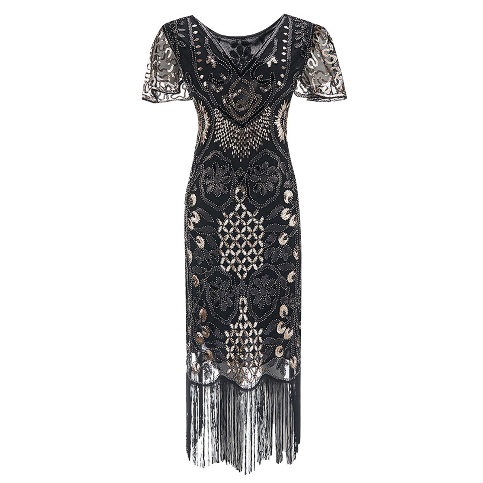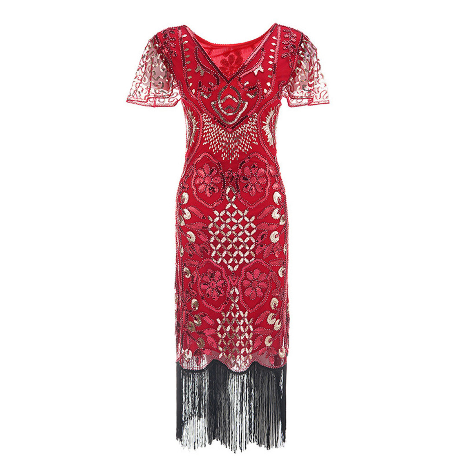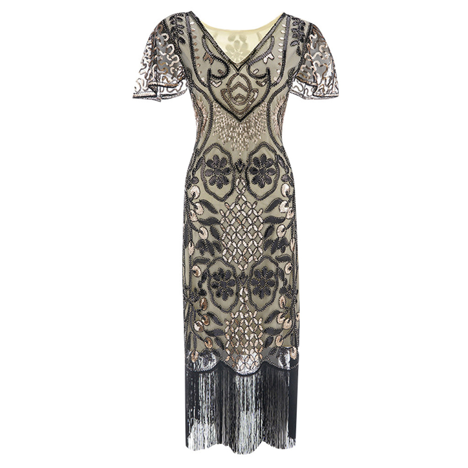 3.V-Шея,КороткийРукав,МидиДлина,Затяните на застежке,Винтажное платье с бахромой по подолу.Очаровательно и привлекательно.Покажите свои изгибы с шармом.