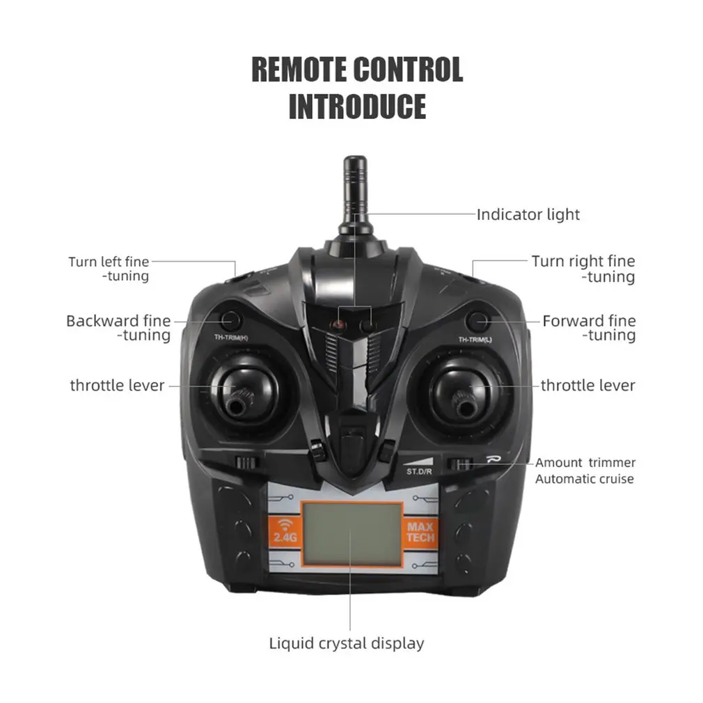 5. Left and right throttle switch: the default left-hand mode is turned on, press the left and right fine-tuning keys and turn on the power switch at the same time, and then release the left/right fine-tuning keys and switch to the right-hand mode after the “di” sound is heard. To restore the left-hand mode, you only need to reboot.