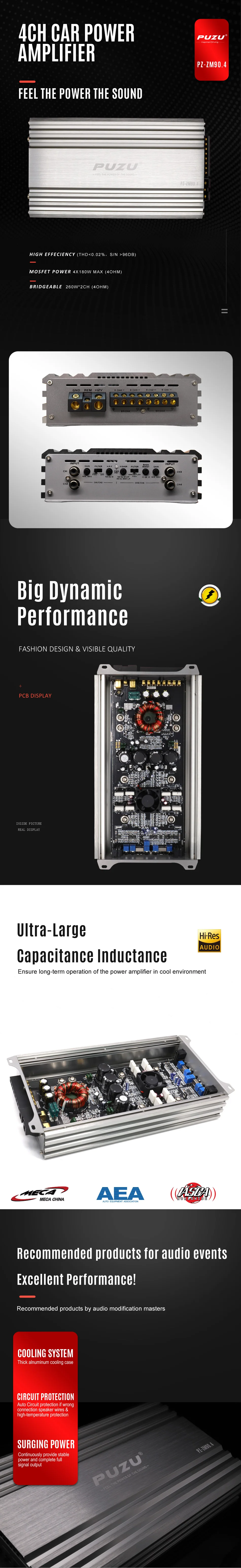 PZ-ZM90.4 4-4-канальный усилитель с пиковой выходной мощностью 720 Вт, мощностью 320 Вт RMS (4x80 @ 4 Ом). Вы также можете установить мост усилителя и получить 2x260 Вт RMS @ 4 Ом. Здесь в PUZU мы предлагаем лучшее соотношение цены и качества в автомобильном аудио. Поэтому мы хотим, чтобы вам было легко сравнить наши продукты с любыми брендами на рынке. Пиковый рейтинг может быть использован для сравнения с брендами, которые используют пиковые оценки, такие как Boss и Power Acoustik, в то время как рейтинг RMS может быть использован для сравнения с топовыми брендами, такими как Kicker, Rockford, Alpine, И т. д.