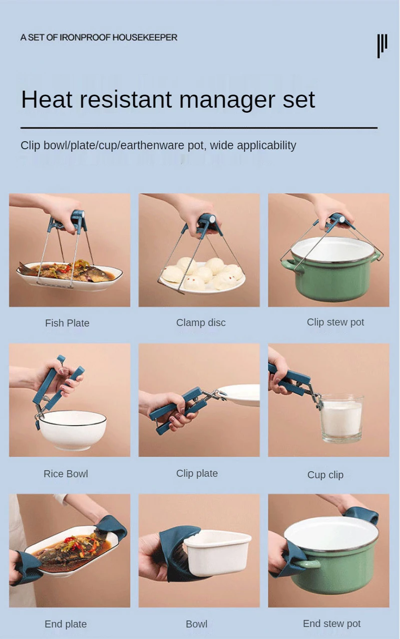 Идеальные кухонные принадлежности: силиконовые анти-обжигающие перчатки предназначены для защиты ваших рук от гриля, выпечки или обработки кухонных и наружных горячих предметов. Грелка для горячей посуды и зажим для чаши-это хорошее решение для закрепления горячей тарелки, лотка, чаши из микро-волн, духовки, воздушной фритюрницы, кипящие горшки безопасно. Этот набор инструментов удобен и прост в эксплуатации, а также экономит пространство. Это должно быть необходимо для вашей кухни.
