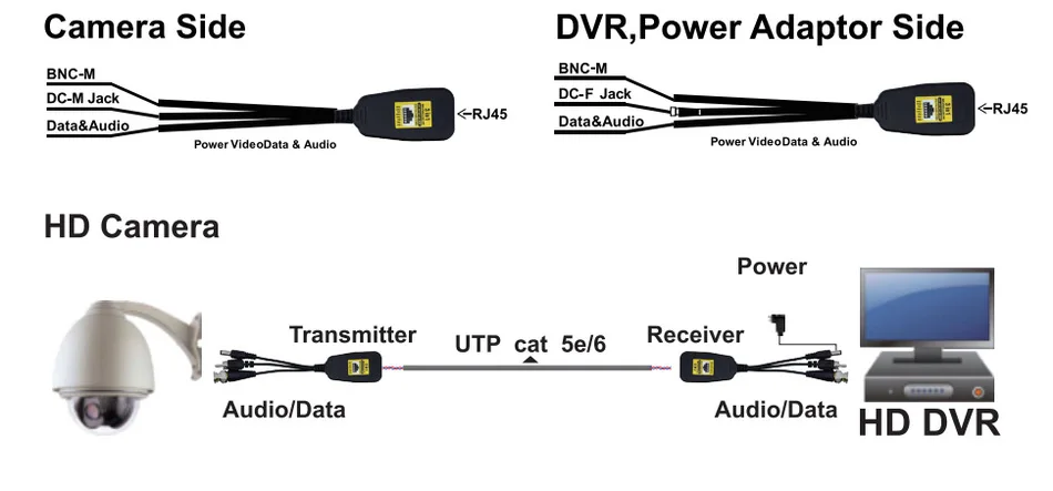 1:RJ45 + DC + BNC интерфейс 2 в 1. Передача видео через UTP CAT5.