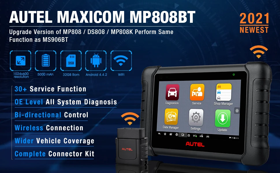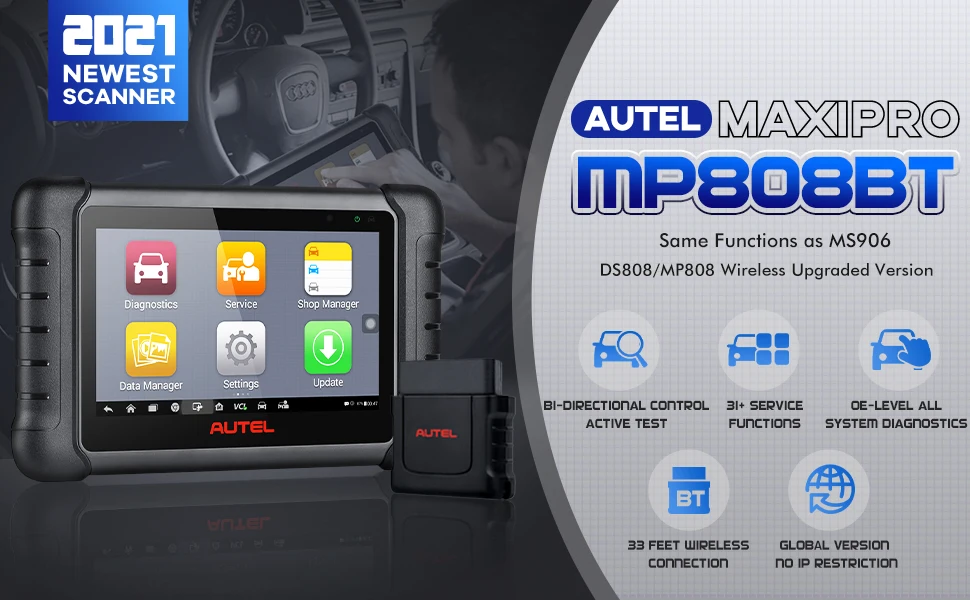 Как 2021 новейший релиз сканеров Autel, беспроводной диагностический сканер Autel MP808BT является обновленной версией MP808/ DS808 и имеет тот же уровень диагностики, что и MS906. По сравнению с MaxiSys MS906, MP808BT не только экономит $220, но и имеет более 11 разъемов для диагностики большего количества автомобилей. Кроме того, MP808BT поддерживает беспроводную связь Bluetooth, до 10 метров (30 футов), чтобы освободить руки.