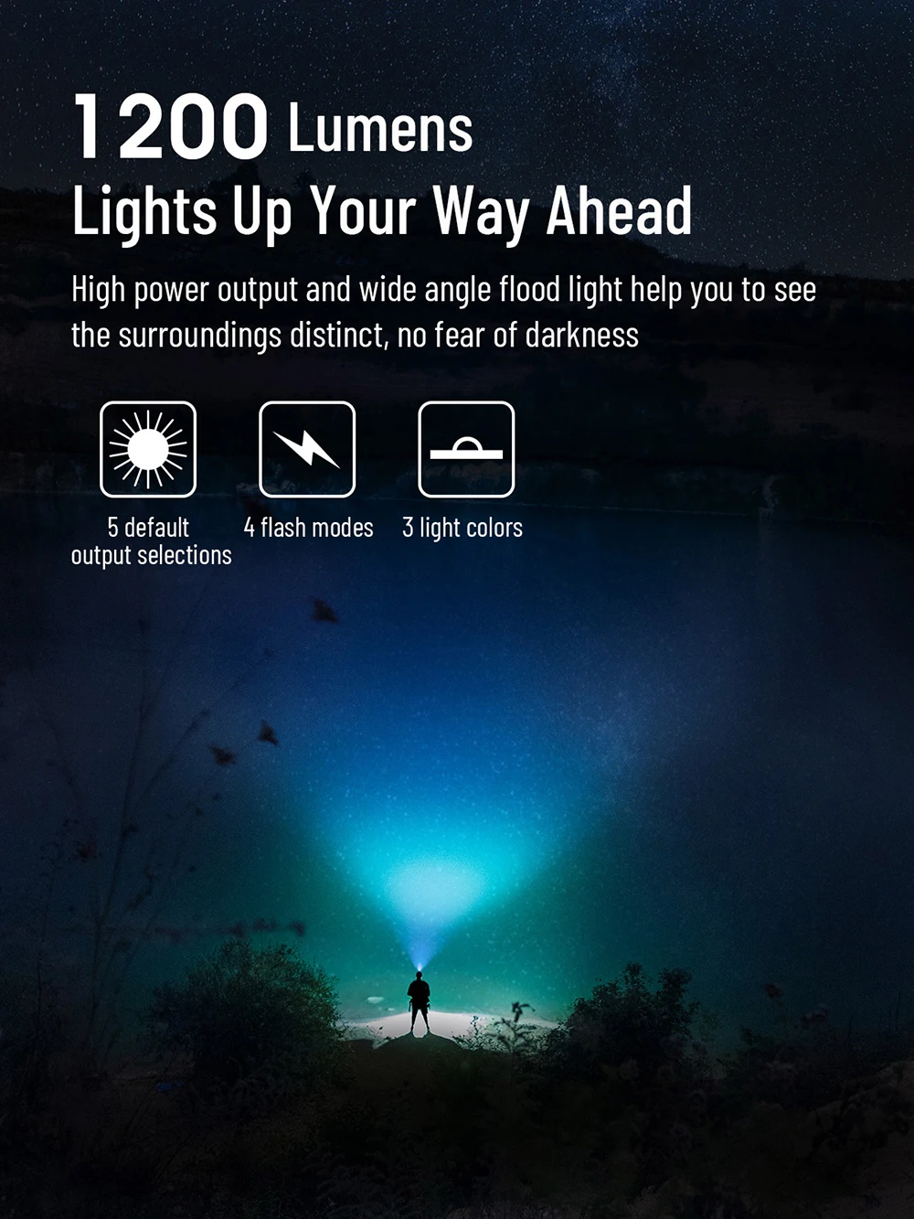 【Супер яркий и 10 рабочих Modes】Налобный фонарь состоит из OSRAM P8 светодиодный лампы и питается от 2600mAh перезаряжаемые батареи, которые могут обеспечить более сильную яркость. 1200 люменов, максимальное расстояние луча составляет 125 метров. С 6 режимами высокий, средний, низкий, лунный светильник, стробоскоп SOS и другой вспомогательный светильник 3 цветов белый светильник, красный светильник и красный стробоскоп
