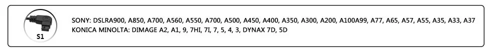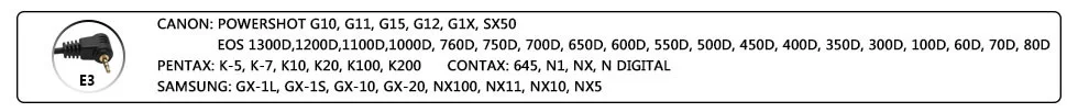 Совместимость с моделями камер: Кабель S2 Совместим с: Для Sony A3000, A5000, A58, A6000, A7, A7R, A7S, A77II, HX300, HX400, HX50v, RX100 Mark II, RX100 Mark III, Для Кибер-съемки: DSC-RX1,DSC-RX1R/RX1R II, DSC-RX10, DSC-RX10 II, DSC-RX100 II, DSC-RX100 III, DSC-RX100 IV,HX300,HX400,HX400V,HX50V,HX90V Кабель S1 Совместим с: Для Sony A900,A850,A700,A580,A560,A550,A500,A350,A300,A200,A100,A99,A77,A77II,A67,A65,A57,A55,A37, a35, A33 Для Minolta: A2,A1,7i,7D,7,5D Кабель N3 Совместим с: Для Canon EOS 10D, 20D, 30D, 40D, 50D, 5D, 5D Mark II, 5D Mark III, 5DS,5DS R,6D, 7D, 7D Mark II, 1D, 1Ds,1D Mark II, 1Ds Mark II, 1D Mark II N, 1D Mark III,1Ds Mark III,1D Mark IV,1D X и 1D C Кабель E3 Совместим с: Для Canon :PowershotG10,G11,G15,G12, G16, G1X,G1XII, SX50 HS, SX60 HS 1300D,1200D,1100D,1000D,760D,750D,700D,650D,600D,550D,500D,450D,400D,350D,300D,100D,60D,60D , 70D,80D Для Pentax:K-5,K-5IIs, K-7,K-30, K-50, K10D,K20D,K100D,K200D, Для Samsung:GX-1L,GX-1S,GX-10,GX20,NX100,NX11,NX10,NX5 Для Contax:645,N1,NX,N DigitalHassleblad: Серия H Кабель DC0 Совместим с: Для Nikon:D800series,D810series,D700,D200,D300series,D2series,D1series,D4,N90s,F5,F6,F100,F90,F90X,D3s Для Fujifilm:S5Pro,S3Pro Для Kodak:DCS-14n Кабель DC2 Совместим с: Для Nikon: DSLR D7200, D7100, D7000, D5500, D5300, D5200, D5100, D5000, D3300, D3200, D3100,D750, D610, D600, D90, Df 90 кабель совместим с: ForFUJIFLM: GFX50S/X-PRO2/X-T2/X-T1/X-T20/X-T10/X-E2S/X-E2/X-M1/X-A10/X-A3/X-A2/X-A1/X100F/X100T/X70/X30/XQ2/XQ1/FINE PIX s1 Кабель UC1 Совместим с: Для Olympus:OM-D,Pen,E30,E100,E400,E410,E420,E450,E510,E520,E550,E600,E 620,SP-510UZ,SP-550UZ,SP-560UZ, SP-565UZ,SP-570UZ,SP-590UZ,SP-810UZ,E-P1,E-P2,E-P3,E-P5,E-PL2,E-PL3,E-PL5,E-PL6, PL7,Stylus 1,E-PM1,E-PM2,XZ-1,E-M1,E-M5,E-M5 MARK II, e-M10, E-M10 MARK II,SZ-30MR,SZ-20,SZ -11,PEN-F