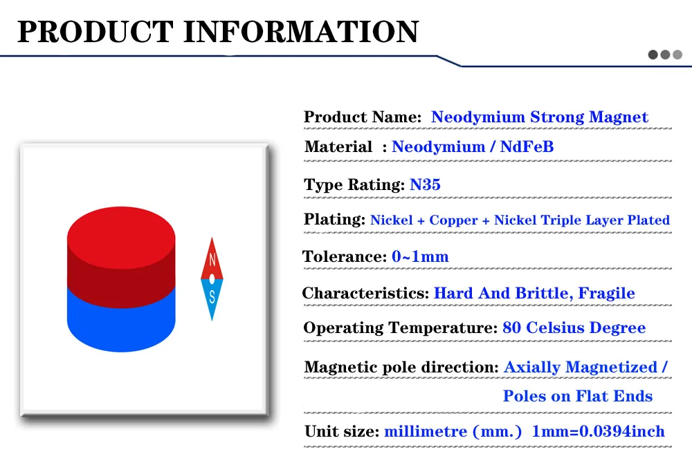 1. Классы мощных магнитов обычно включают N30, N35, N38, N40, N45, N50, N52 и т. д. чем выше степень магнита, тем выше магнитная сила. Класс магнитов нашего магазина N35. Пожалуйста, купите соответствующие магниты в соответствии с фактическими потребностями приложения.