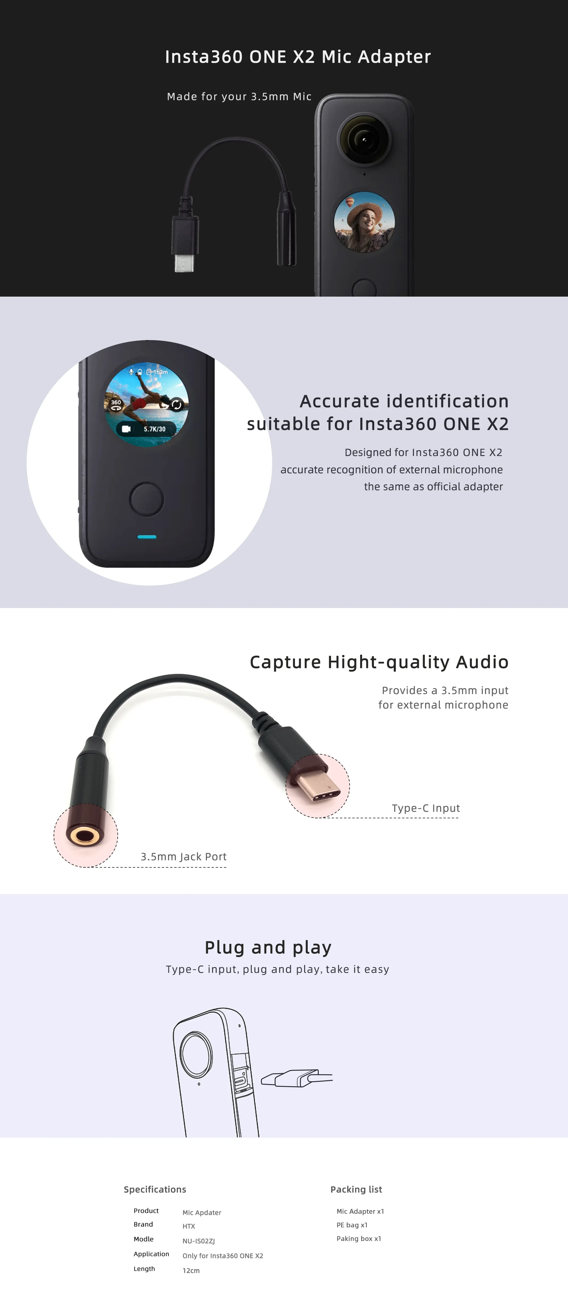 -Точная идентификация, подходит для спортивной камеры insta360 one x2: внешняя идентификация микрофона легко подключается, официальный адаптер только для одного X2.