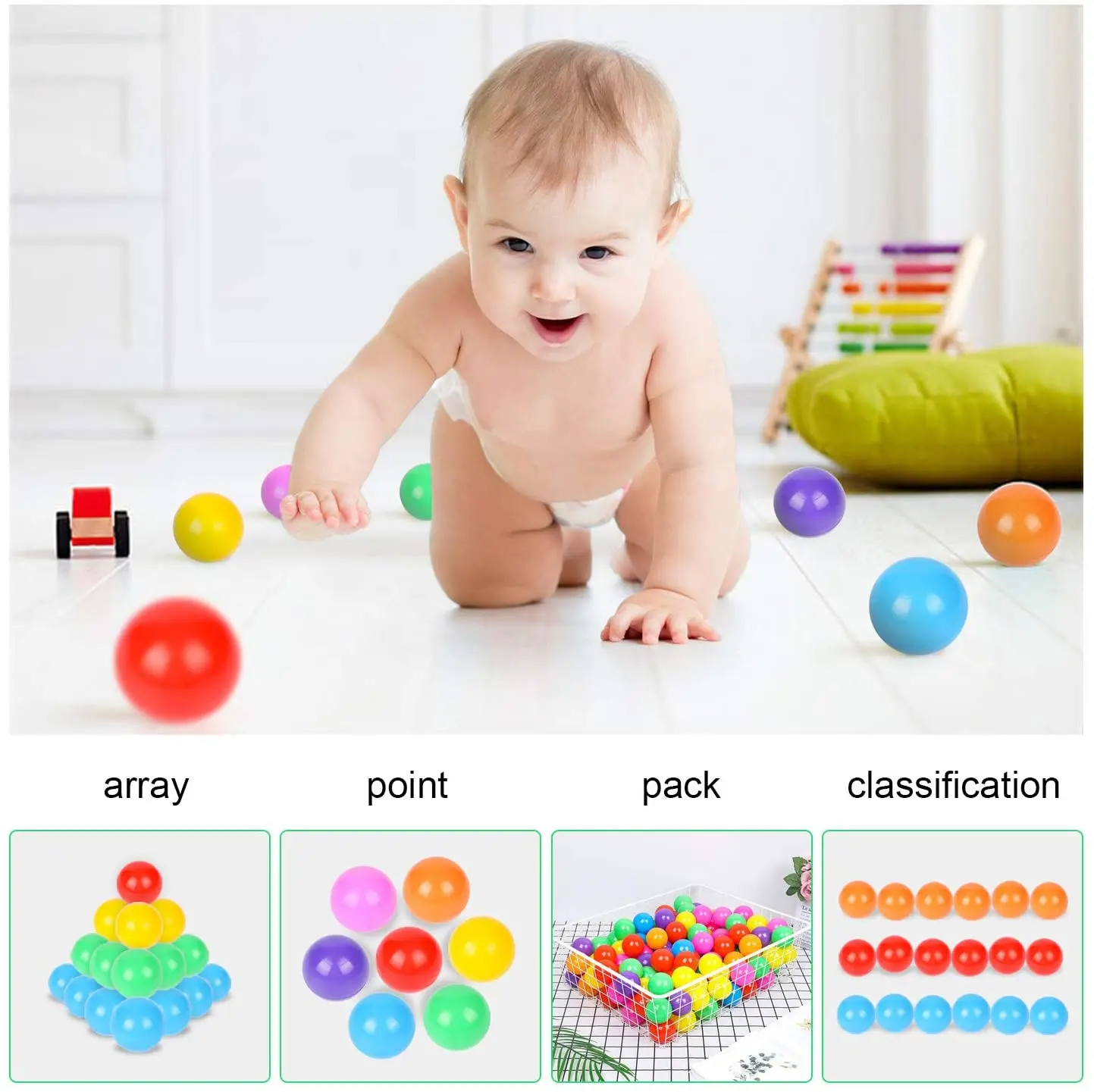 Playing balls helps develop hand-eye coordination and promote physical activities. Encourages physical play and hand-eye coordination motor skill development.