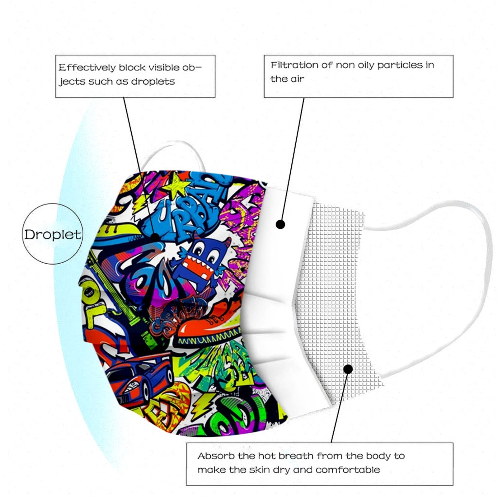 Изготовлен из экологически чистого материала, влагостойкий, нетоксичный, не раздражающий, мягкий и удобный Дышащий материал и специальные узоры, что делает его полезным и модным Специальный 3 слоя из нетканого материала, дизайн, обеспечивает защиту от пыли, автомобильный отходящий газ, пыльцу и т. д Идеальный дизайн, когда вы носите его, он легко помещается в лицо. Эластичная петля для ушей легко носить и не давит на уши Размер: 14.5x9, 5 см/5.71x3.74inПосылка включает в себя: