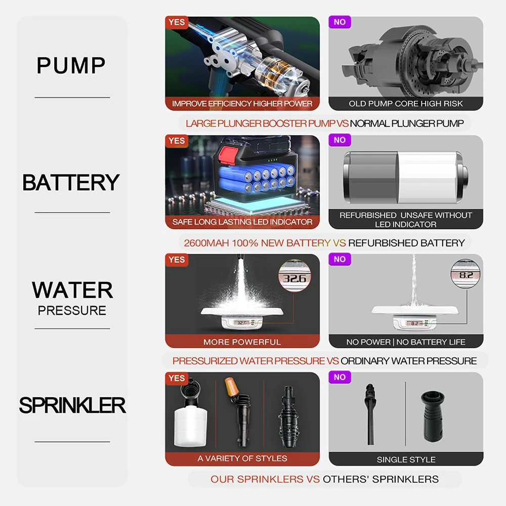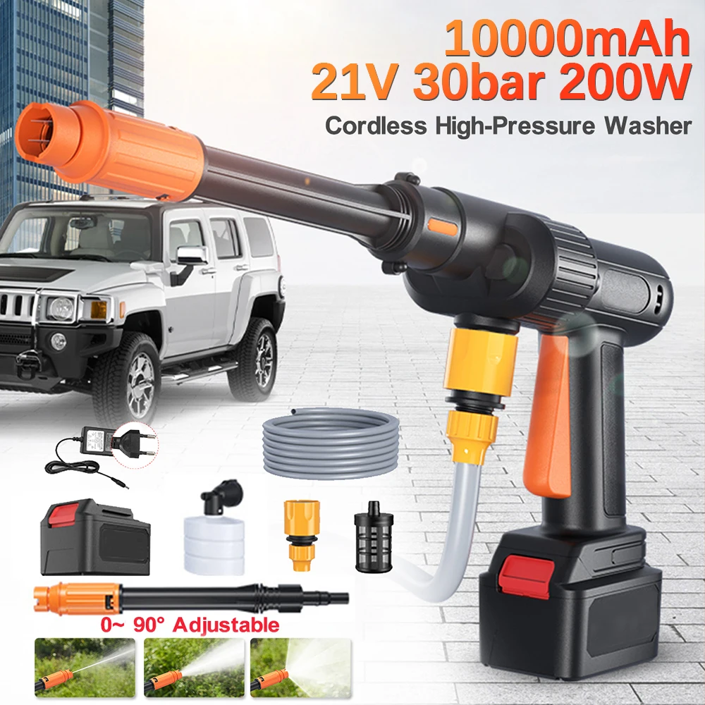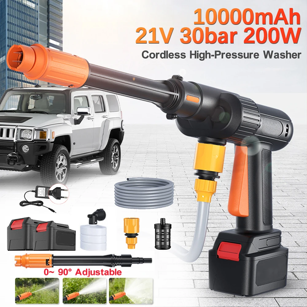 [Портативная беспроводная мойка высокого давления]-максимальное рабочее давление составляет 435 фунта на кв. дюйм/30 бар, а расход составляет л/ч. Оснащен литиевым аккумулятором 21 в 10000 мАч. Долгий срок службы батареи, связанный с аккумулятором большой емкости, не боится потерь мощности, вызванных длительным временем чистки. Вы