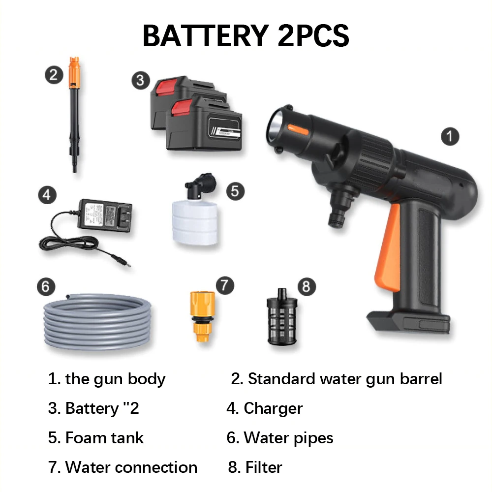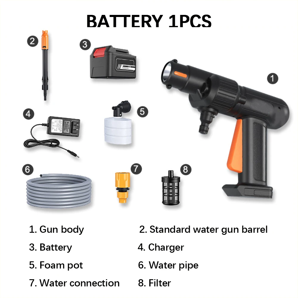 Водяной пистолет высокого давления * 1 + 5 м водопроводная труба * 1 + стержень для распыления воды * 1 + разъем для воды * 1 + сетка фильтра * 1 + пенопласт * 1 + литиевая батарея 21 в * 1 + зарядное устройство * 1 + руководство на китайском и английском языках * 1