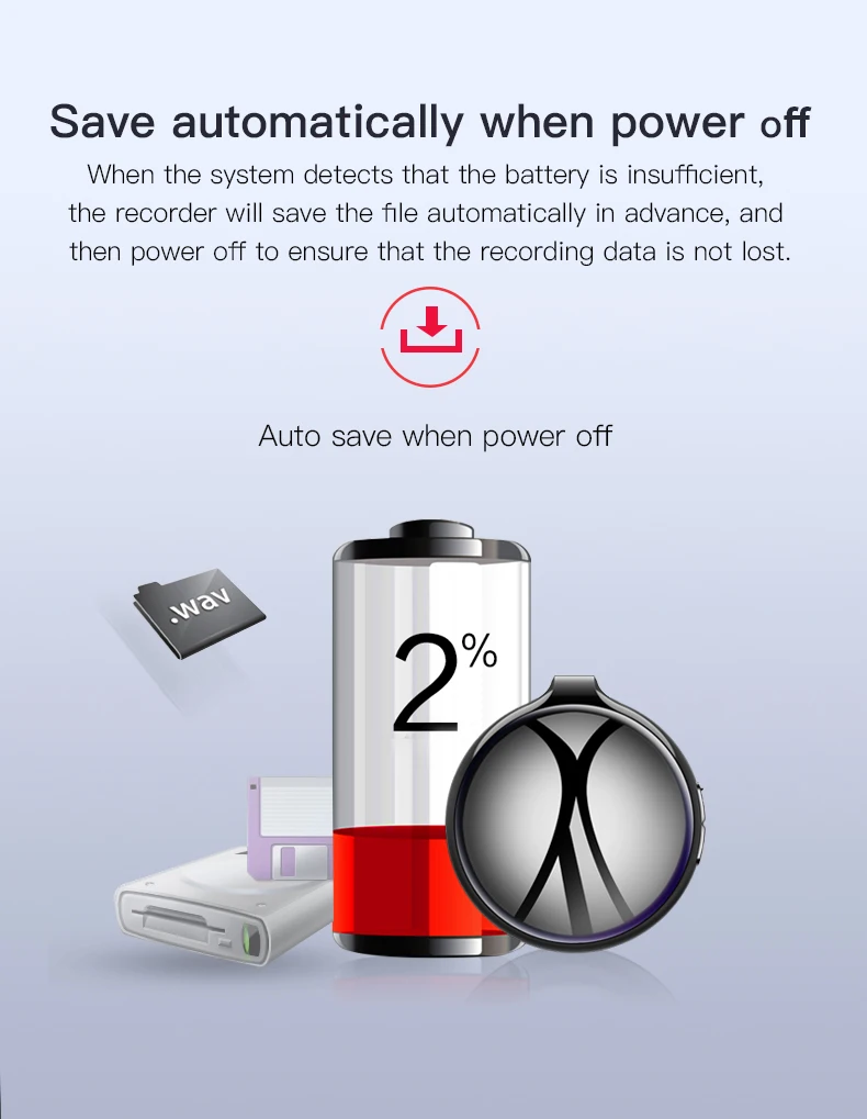 Когда система обнаруживает, что заряда батареи недостаточно, регистратор автоматически сохраняет файл заранее, а затем отключается, чтобы гарантировать, что данные записи не потеряны.