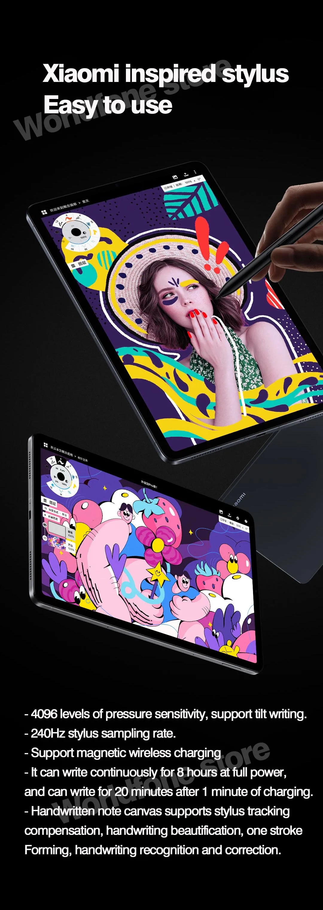 -4096 уровней чувствительности к давлению, поддержка записи наклона.