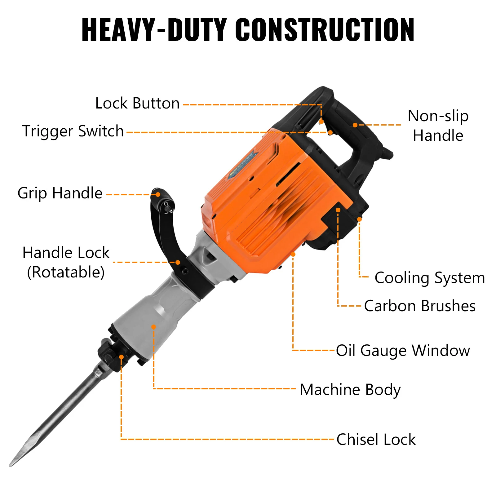Двигатель из чистой меди имеет сильную мощность3500Ватты обеспечивают 1400 ударов в минуту, чтобы легко прорваться через бетон, кирпич, землю и землю. Высокая грузоподъемность и высокая эффективность также означают повышение производительности.