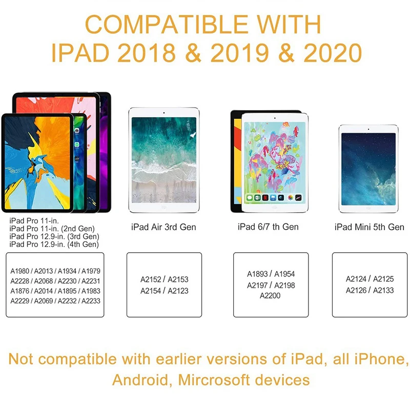 Совместимые модели: этот стилус совместим только с Apple iPad 2018 и более поздних версий, включая iPad 6/7/8th поколения, iPad Pro (12,9 дюйма) третьего/четвертого поколения, iPad Pro (11 дюймов) Первое/второе поколение, iPad Air 3/4-е Поколение и iPad mini-пятое поколение iPad.