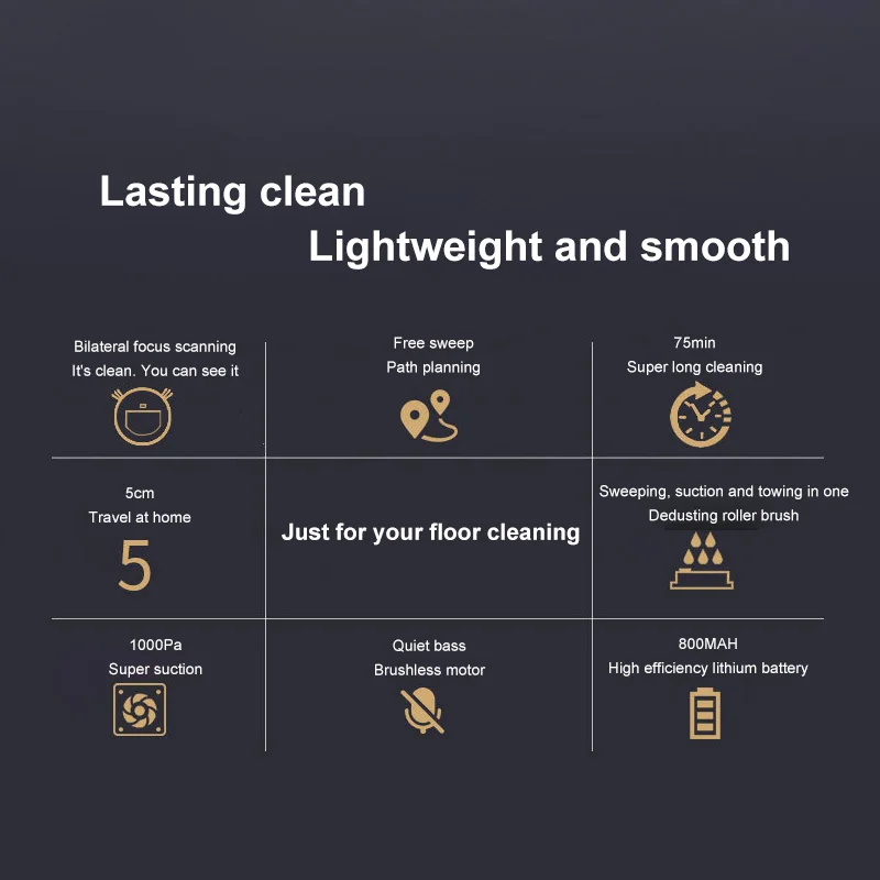 4. Функция: Запуск одной кнопкой, подметание, Швабра, пылесос, зарядка через USB, универсальное вождение, автоматическое Предотвращение препятствий, защита от падения, низкий уровень шума и интимность, низкая повторяемость, высокий охват.