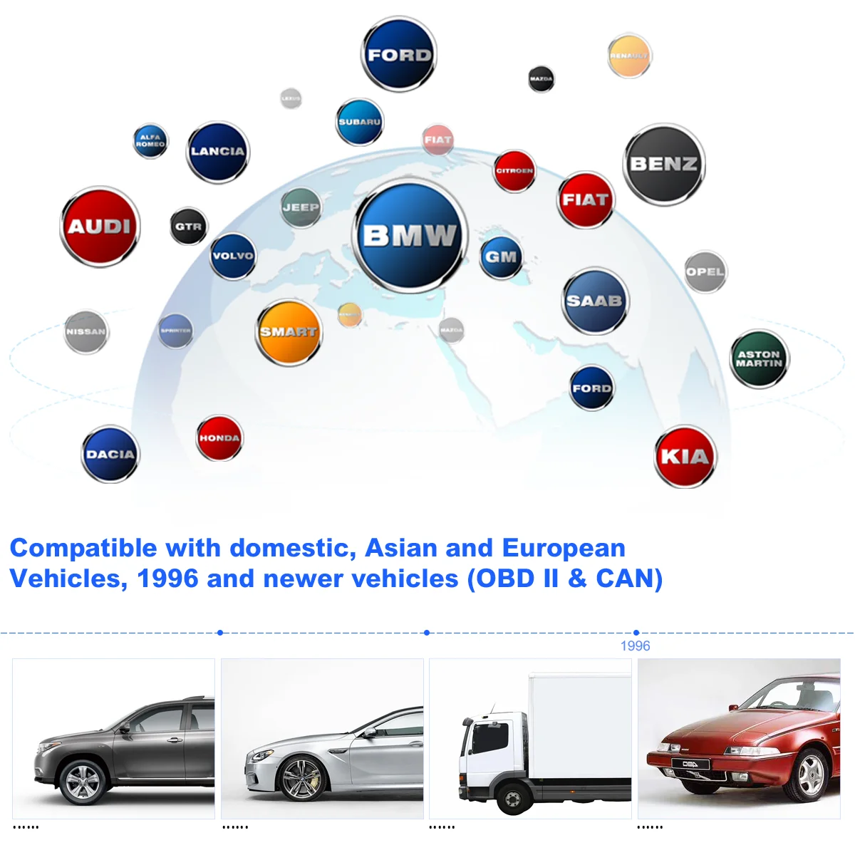 • Совместимость с отечественными, азиатскими и европейскими транспортными средствами, 1996 и более новыми транспортными средствами (OBD II и CAN)