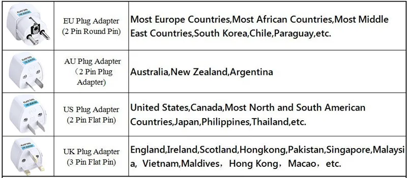 Regarding plugs, we provide EU adapters. If it does not meet your requirements, please see which adapter you need in the pictures we provide. When you place an order, please note it (for example, "I need a No.7 Italian adapter"), and we will send the corresponding adapter according to your request.