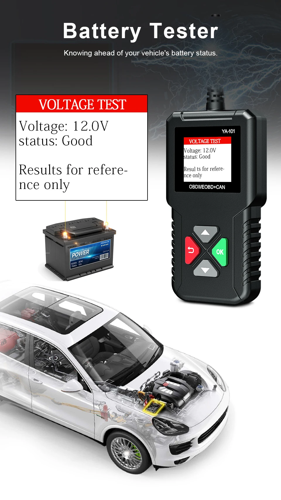 > Да, для двигателя, он может читать скрытые коды с функциями потока данных; Для батареи, он может получить раннее предупреждение с помощью функции тестирования напряжения батареи с помощью диагностического инструмента считывателя кода YA101