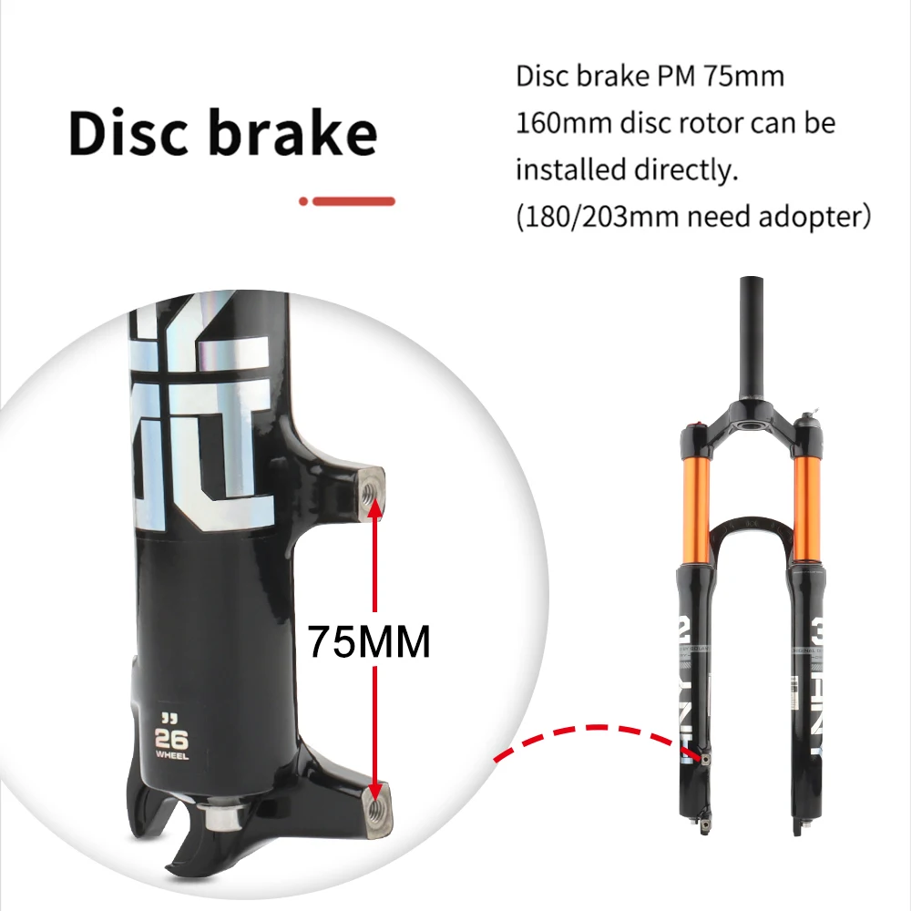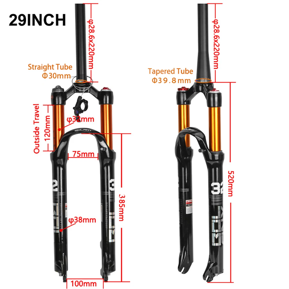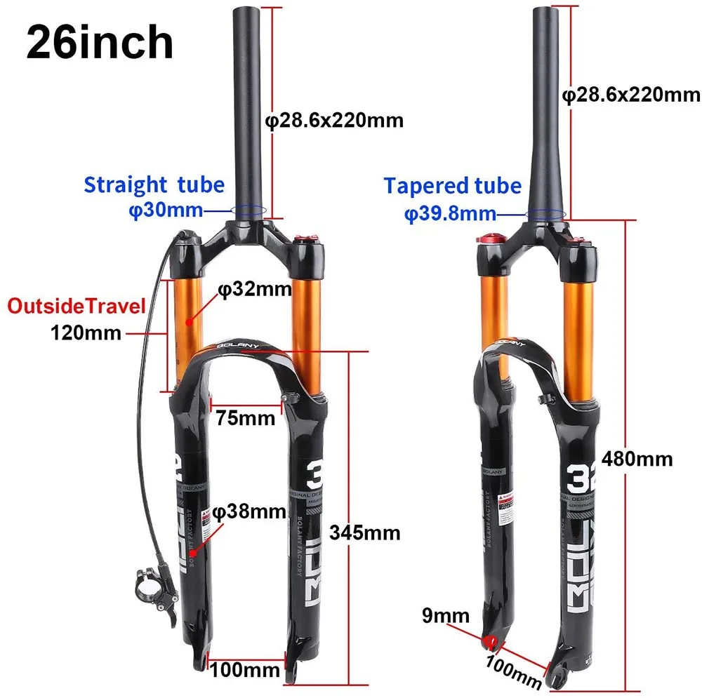 Технические характеристики: 26/27,5/29 дюймов опционально, в том числе зауженные шток и прямой шток идут в двух вариантах: Корона Ручная Блокировка и дистанционное устройство блокировки два устройства блокировки. Путешествия: 100 мм. Ось: 9 мм * 100 мм, тип тормоза: дисковые тормоза