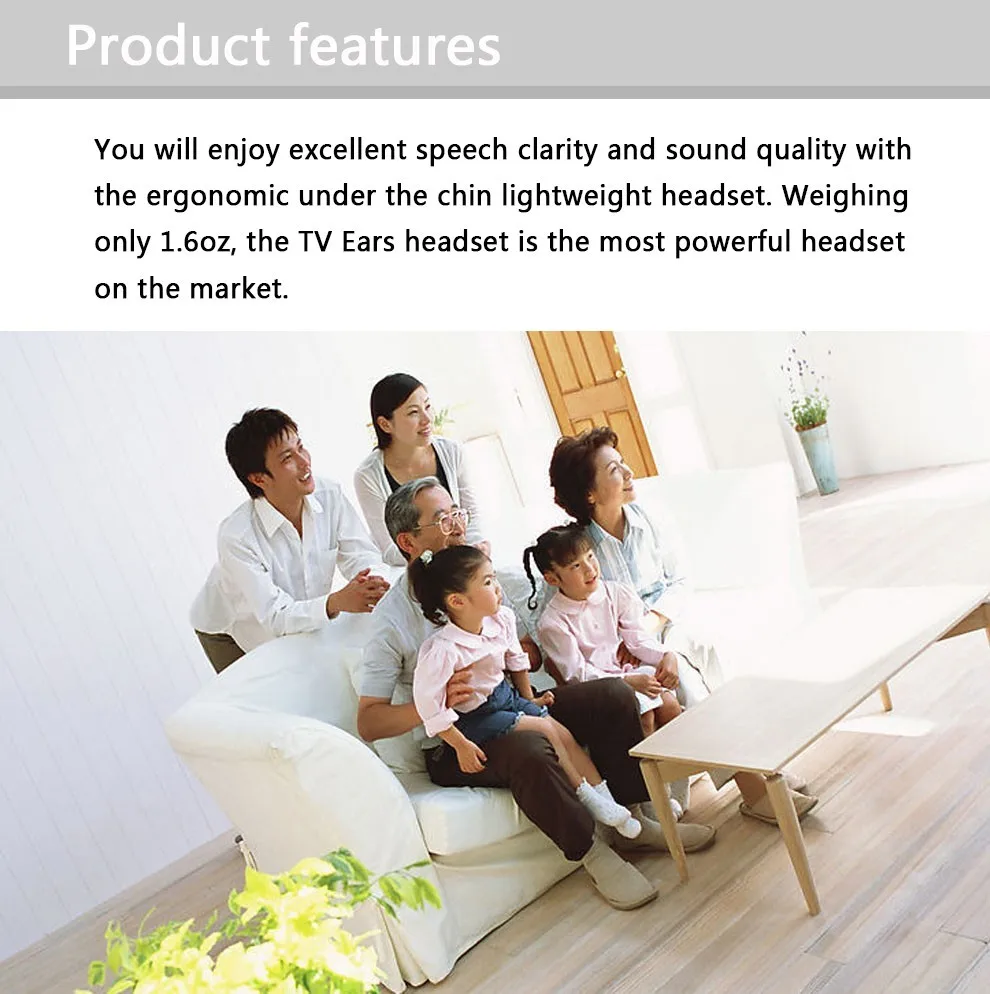 Это 2,4 GHz цифров Беспроводной подбородка гарнитура использует новейшие цифровые Беспроводной технологии, И позволяет улучшить возможности слухового аппарата, которые могут потребоваться пожилым людям, чтобы наслаждаться кристальной стереозвуком и ТВ-звуком в любом месте внутри вашего дома. Просто подключите передатчик к желаемому источнику аудио: dvd-плееру, cd-плееру, телевизору, Hi-Fi системе или iPod. Без сложного подключения и установки система позволяет наслаждаться захватывающим, реалистичным звуком в течение нескольких минут.