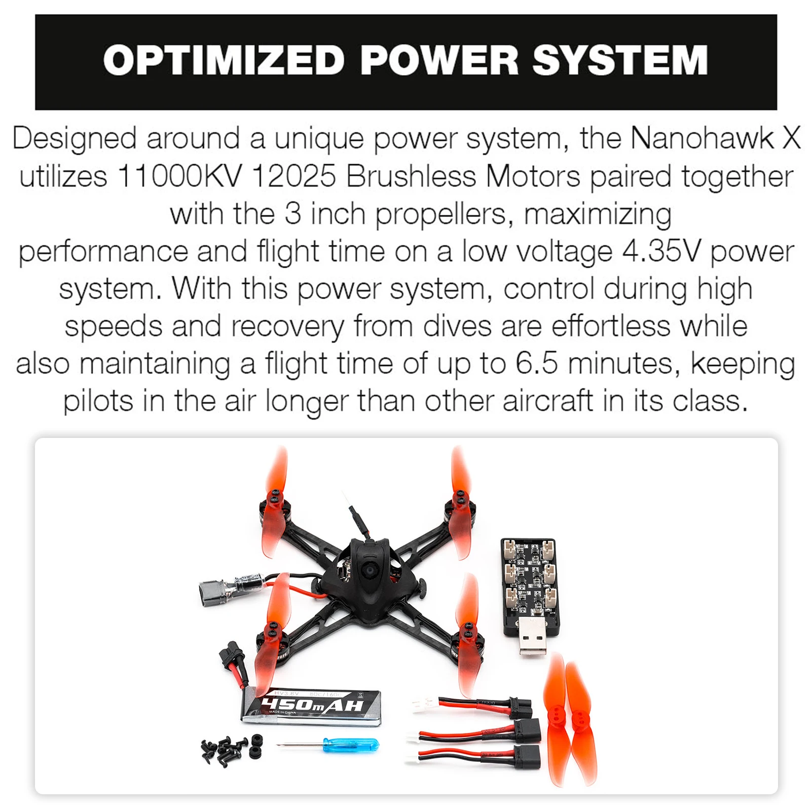 Оптимизированная Система питания: разработанная вокруг уникальной силовой системы, Nanohawk X использует бесщеточные двигатели 12025 кв в паре с 3-дюймовыми пропеллерами, что обеспечивает максимизацию системы. С этой системой питания Управление во время высокой производительности и времени полета на низком напряжении 4,35 в и восстановление после погружений не требуют усилий, а также поддерживает время полета до 6,5 минут, держите пилотов в воздухе дольше, чем другие самолеты в своем классе.
