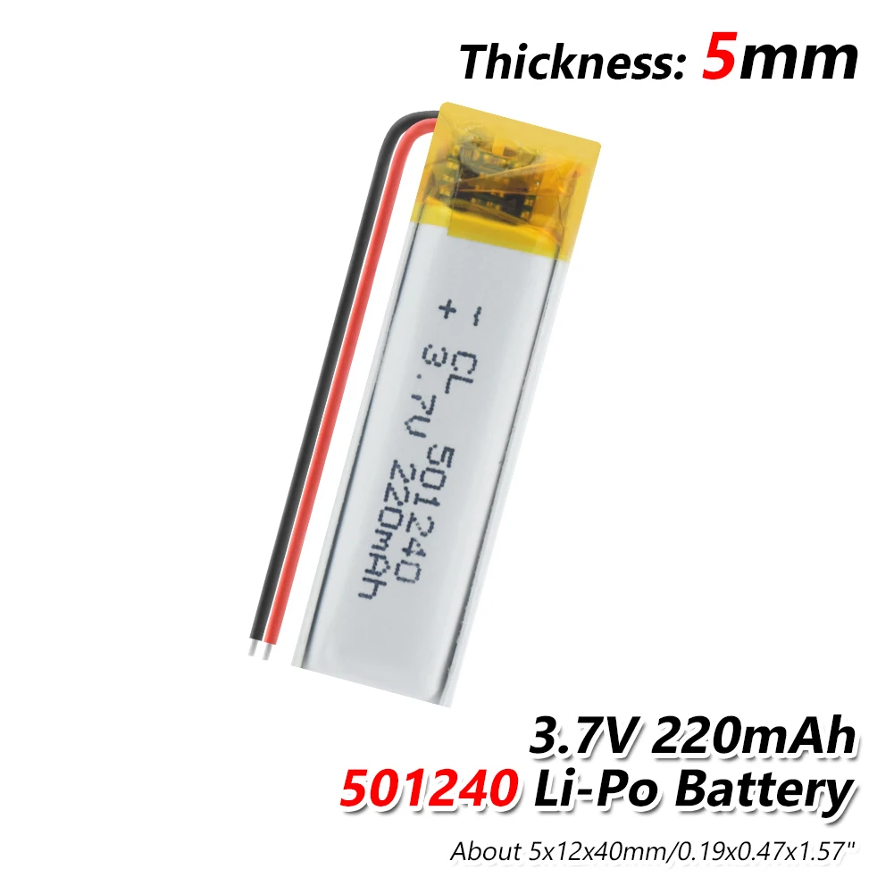 High quality 501240 rechargeable lithium polymer battery with two wire leads.