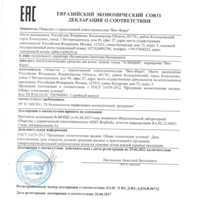 Средство косметическое для ухода за волосами и кожей головы - лосьон - тоник «Эсвицин» - это новый эффективный продукт